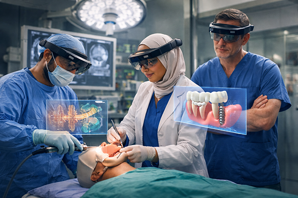 Augmented reality, or AR, overlays digital information onto the physical world in real time. In surgery and dental training, this means projecting 3D anatomical models, surgical pathways or restorative designs directly into the clinician’s field of view.