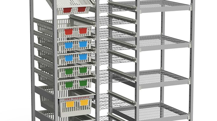 Upgrade option for baskets using 35kg soft-close telescopic runners for heavier items such as fluid bags and nutrient feed, reducing risk of manual handling injury.