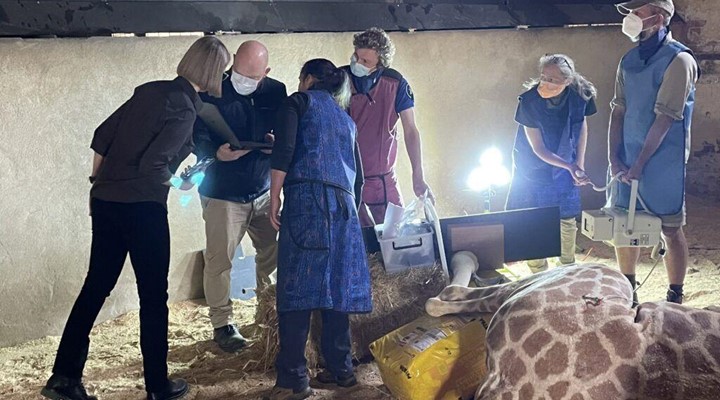 We waited for our turn while Nolean received her treatment. When the signal was given, we were ready. Veterinary doctors and assistants performed almost a yoga dance around the giraffe. Nolean was asleep with her head propped up on hay cushions, constantly massaged by another team to ensure perfect blood flow throughout this short procedure. This is where human flexibility was tested. Blocks of hay and anything possible were used to prop up Nolean’s feet for multiple X-rays. These needed to be taken quickly, at multiple exposures, from different angles, and on both feet for comparison.