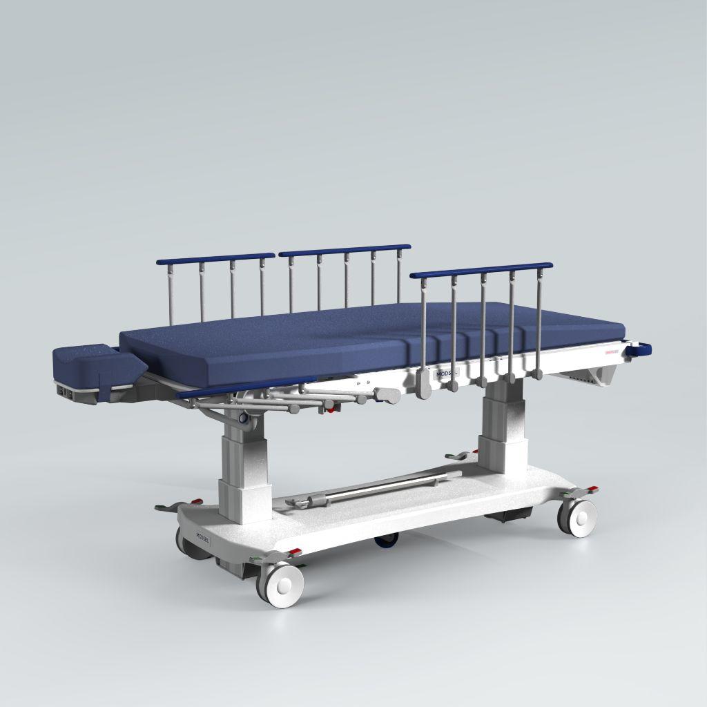 These fall vertically down and back under the stretcher top. These are traditionally longer in overall length then the sideways folding designs, as they don’t require a gap at either end of the stretcher top for folding. The drop away style can provide a completely free top surface with no side rail components or handrail to obstruct the patient or carers and allows for a zero-transfer gap during bed-to-bed transfers. As the raised height still has minimum requirements for best patient support, dropping the full side rail height down under the stretcher top can restrict both the low height and width of the stretcher top.